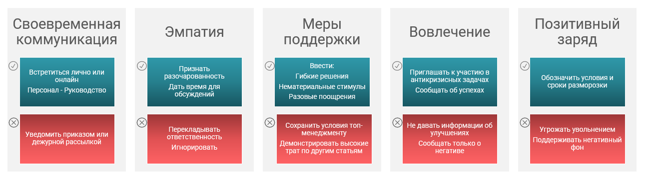 Неверно: оставить персонал без информирования об изменении ситуации в компании.
